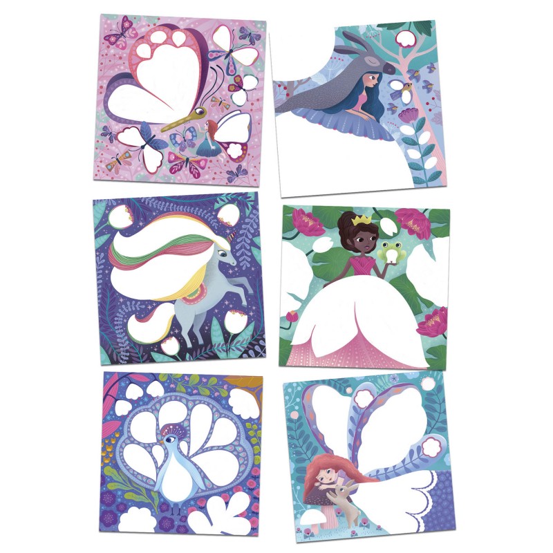 Quatre couleurs vives accompagnent des illustrations adorables sur le thème du monde féerique.